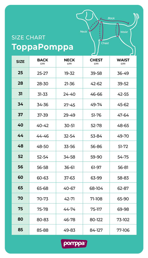 Bitte beachten Sie, dass die Rückenlänge von ToppaPomppa 2 cm länger ist als bei anderen Pomppa-Mänteln ähnlicher Größe. Wenn Ihr Hund eine Zwischengröße hat, empfehlen wir, die kleinere Größe zu wählen.
